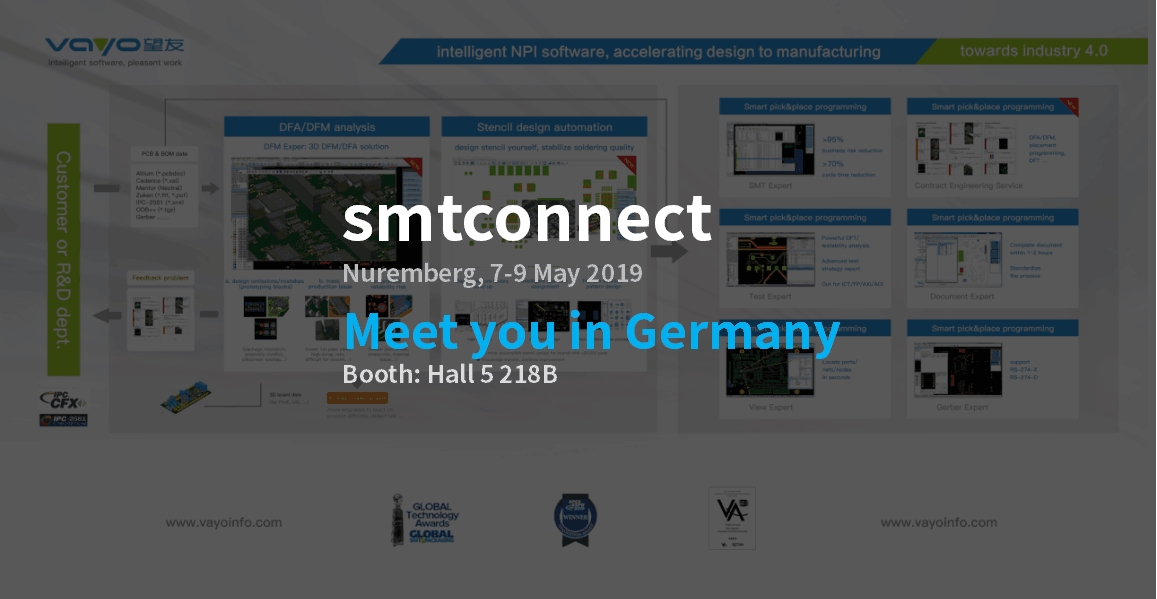德國紐倫堡國際集成電路展覽會(SMTCONNECT)前身為SMT混合封裝,是歐洲最專業的集成電路展覽會。主辦單位為德國法蘭克福展覽公司,舉辦周期為1?年?1?屆。該活動為社區交流提供了空間,也為創建定制的解決方案、啟動業務事務和培訓提供了空間。與該展同時舉行的國際電子電路會議(Electronic Circuits World Convention ECWC),研討電子電路的發展方向。上屆展會總面積26800平方米,參展企業419家,參展人數達15156人。SMTCONNECT還設有展會論壇,30多個產品展示、座談等。望友將展示最新的NPI系列軟件解決方案,歡迎蒞臨或咨詢!