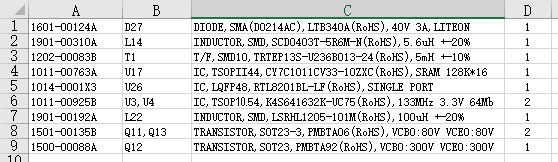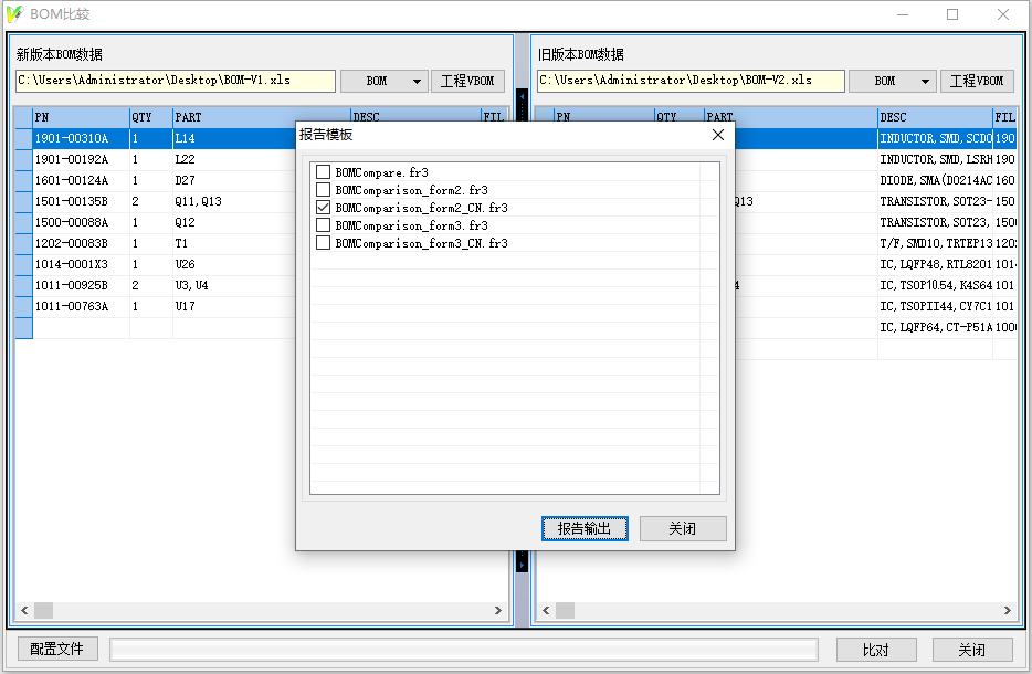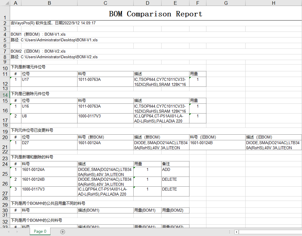 1.4:查看報告,報告中詳細列出了兩份BOM文件的同一物料的數(shù)量、位號等修改情況,以及是否物料增加或者刪除等