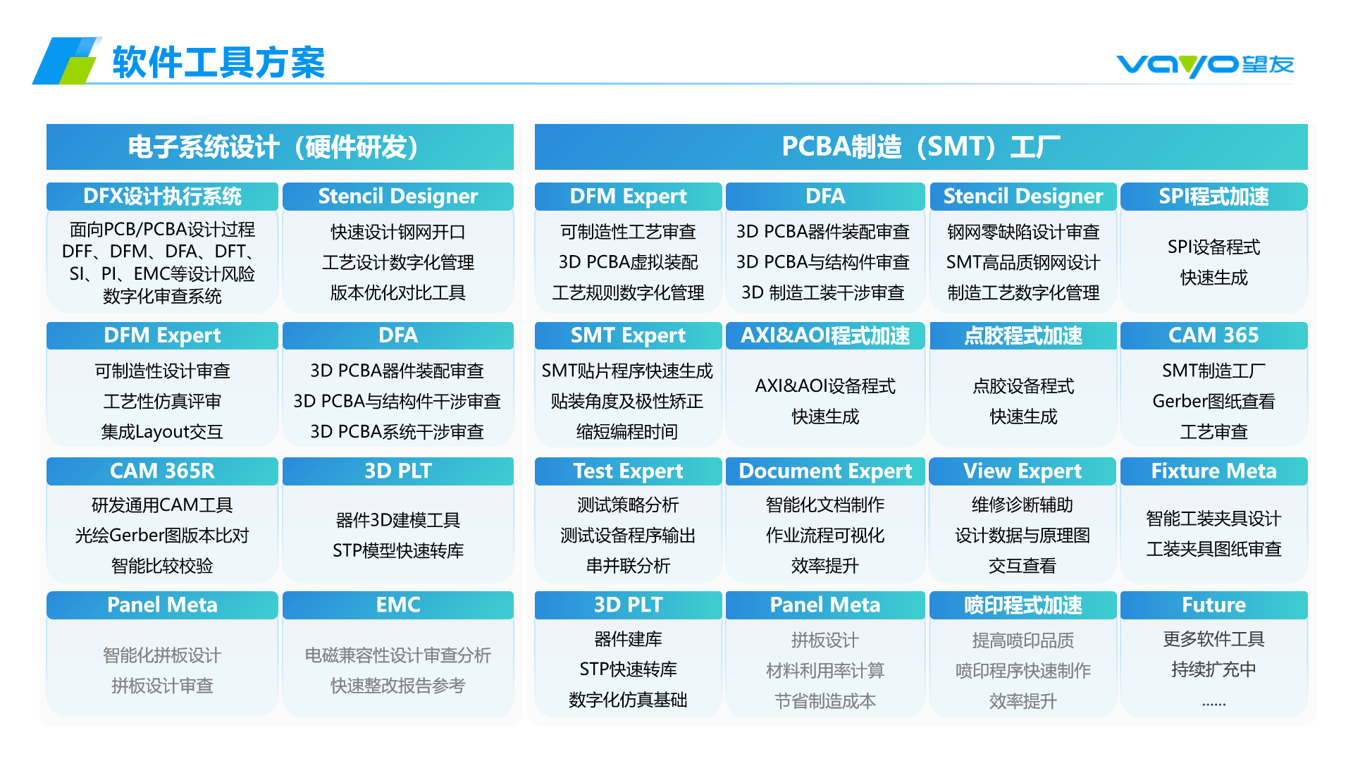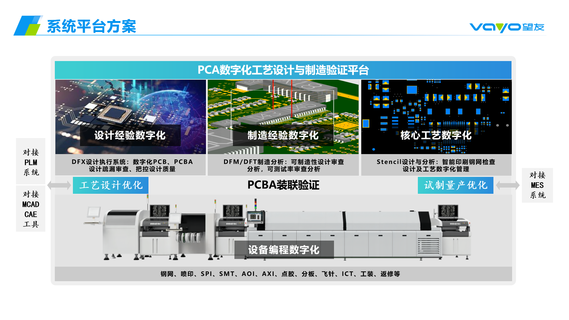 20年專注,聚焦于PCB/PCBA工藝設(shè)計(jì)領(lǐng)域,致力打造自主可控的集成電子電路系統(tǒng)EDA及CAM軟件,主要產(chǎn)品包括DFX設(shè)計(jì)執(zhí)行系統(tǒng)、DFM可制造性工藝設(shè)計(jì)分析、SMT智能貼片編程、stencil數(shù)字化設(shè)計(jì)工藝以及覆蓋從設(shè)計(jì)到制造全流程的PCA數(shù)字化工藝設(shè)計(jì)平臺。產(chǎn)品體系通過對設(shè)計(jì)及制造端數(shù)據(jù)驗(yàn)證和分析,從源頭解決電子產(chǎn)品核心設(shè)計(jì)研發(fā)與制造端脫節(jié)、產(chǎn)品質(zhì)量不高、附加值低等問題,克服工藝設(shè)計(jì)短板,賦能工業(yè)企業(yè)智能制造高質(zhì)量發(fā)展。