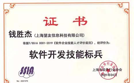 4月29日望友科技收到來自上海市軟件行業協會授予的“軟件開發技術標兵”證書,該證書是協會授予望友科技研發部門主管錢勝杰的。
